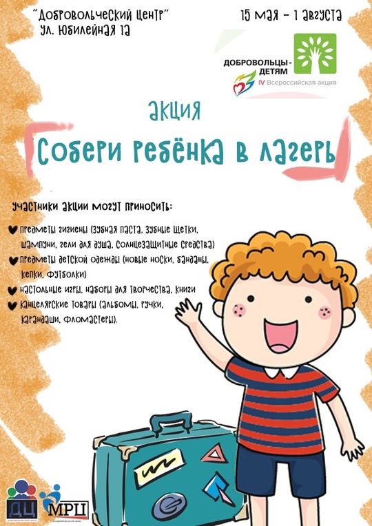Акция "Собери ребенка в лагерь" направлена на оказание помощи семьям, оказавшимся в трудной жизненной ситуации в целях сбора вещей для отправки ребенка в летний оздоровительный лагерь.