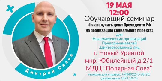 Центр инноваций социальной сферы Ямало-Ненецкого автономного округа 19 мая 2019 года в 12:00 в городе Новый Уренгой по адресу: м-н Юбилейный 2/1, МДЦ "Полярная Сова" планирует провести обучающий семинар "Как получить грант президента РФ на реализацию социального проекта". Семинар проведет заместитель председателя экспертного совета общенациональной Ассоциации ТОС, член Общественной палаты Республики Коми, руководитель Проектного центра инициативного бюджетирования Республики Коми- Дмитрий Сизев.